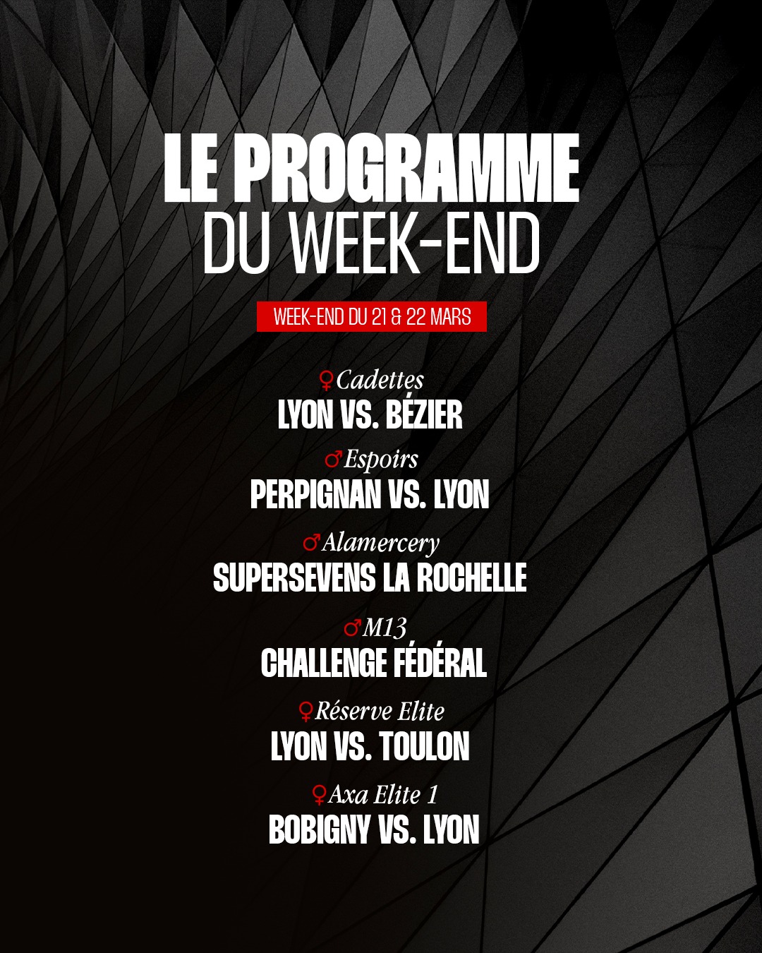 Découvrez le programme de l'ensemble des équipes qui représenteront le LOU Rugby sur les terrains ce week-end :
